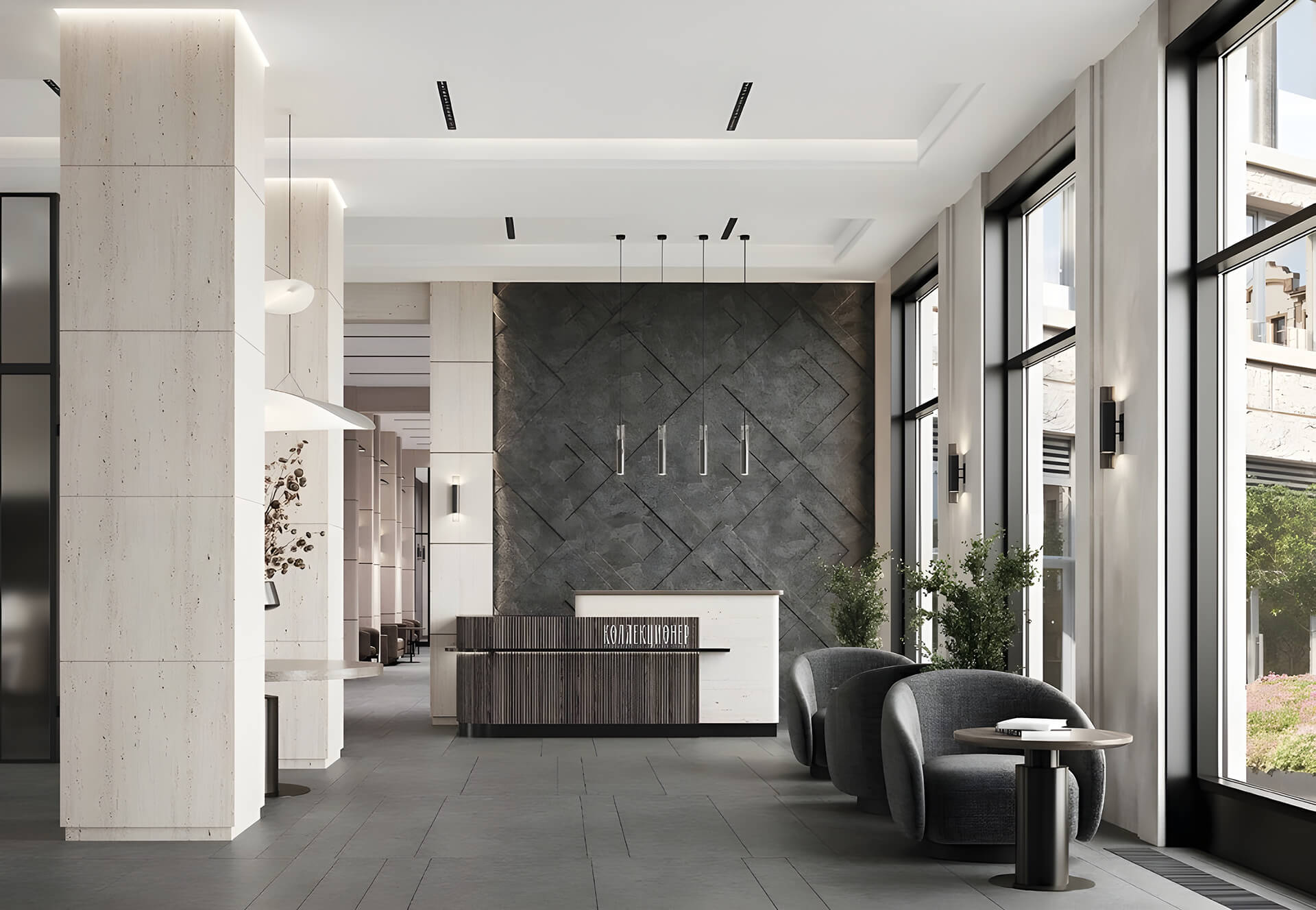Лобби «Коллекционера» — это не просто входная группа, а арт-пространство. Высота потолков 4,1 м, панорамные витражные окна и натуральные материалы отделки создают ощущение света и простора. Роскошная welcome-зона плавно перетекает в анфиладную галерею, где размещены картины Латифа Казбекова и скульптуры Виктора Грачёва.