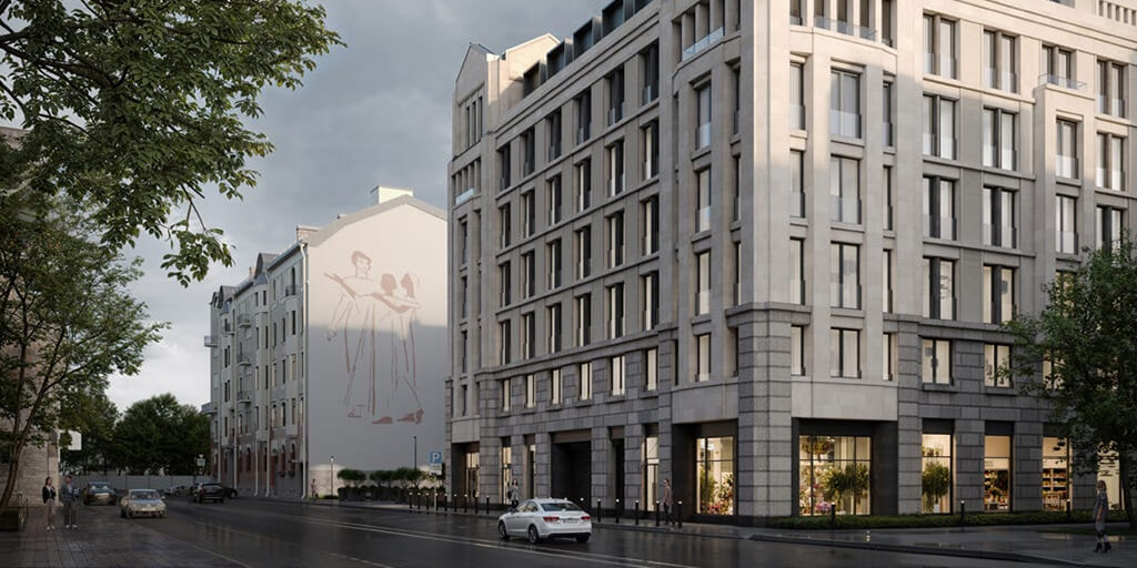 Проект расположен в самом сердце Петроградской стороны, окружённой архитектурными шедеврами модерна. Дом гармонично вписан в ткань исторической застройки, но при этом выглядит как редкая жемчужина в собрании знаковых зданий. Эклектичные фасады, башни и люкарны подчеркивают монументальность и высокий статус дома. Приватный внутренний двор в стиле испанского патио дополняет концепцию «дома как произведения искусства».