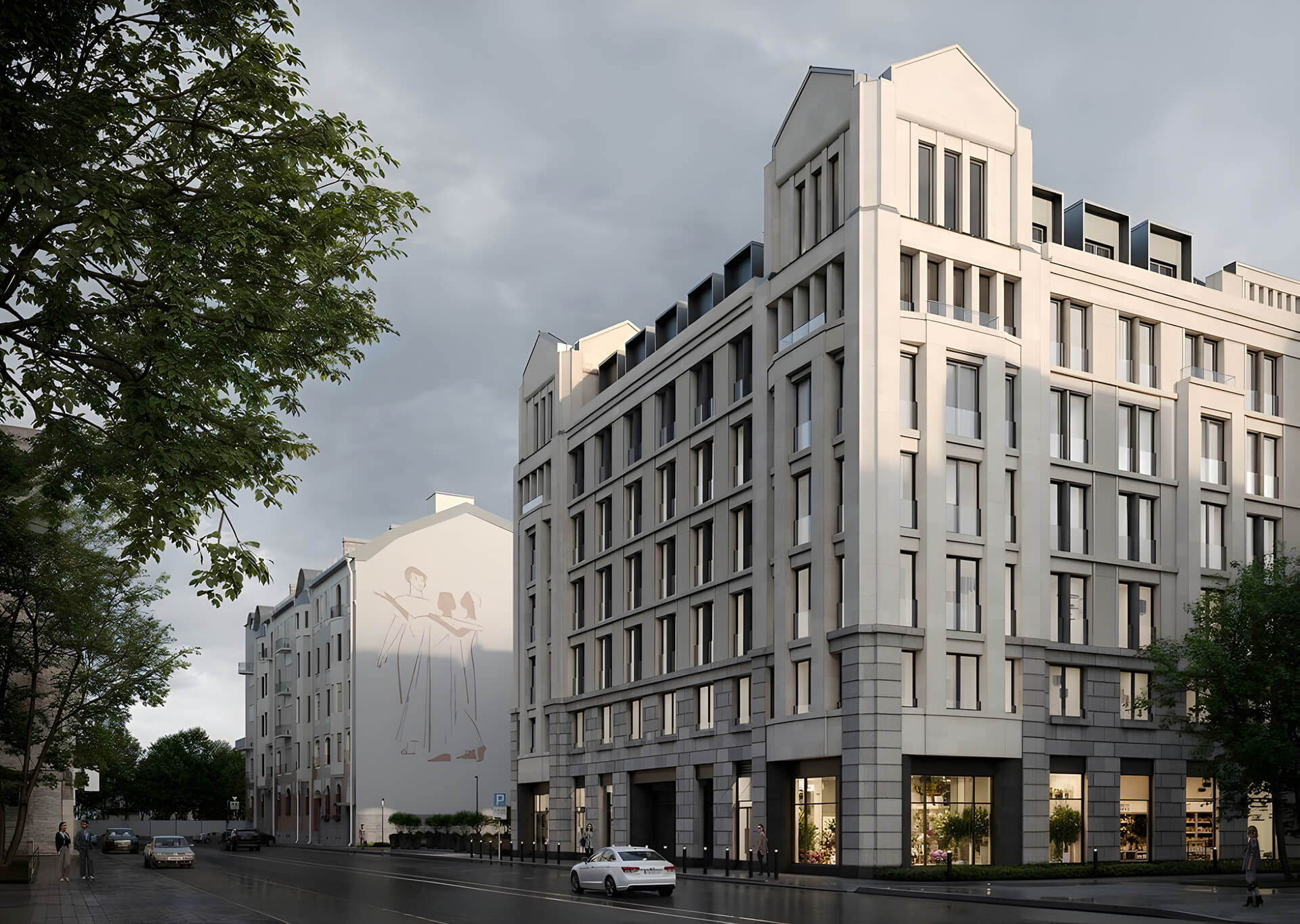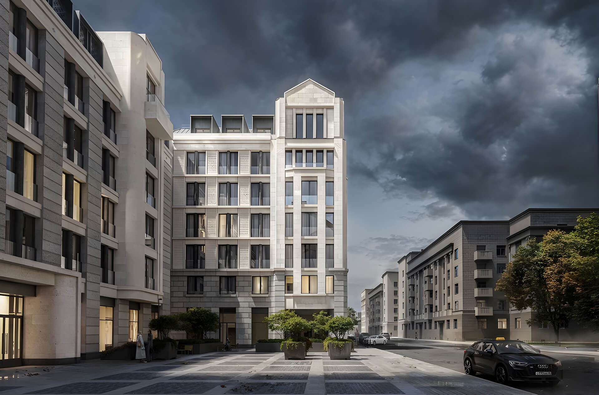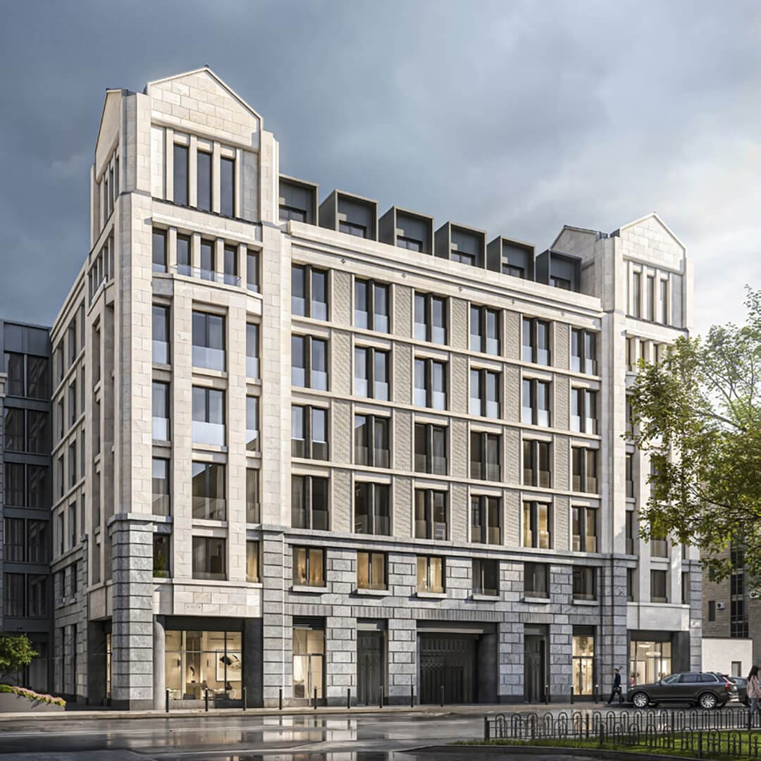 Проект расположен в самом сердце Петроградской стороны, окружённой архитектурными шедеврами модерна. Дом гармонично вписан в ткань исторической застройки, но при этом выглядит как редкая жемчужина в собрании знаковых зданий. Эклектичные фасады, башни и люкарны подчеркивают монументальность и высокий статус дома. Приватный внутренний двор в стиле испанского патио дополняет концепцию «дома как произведения искусства».