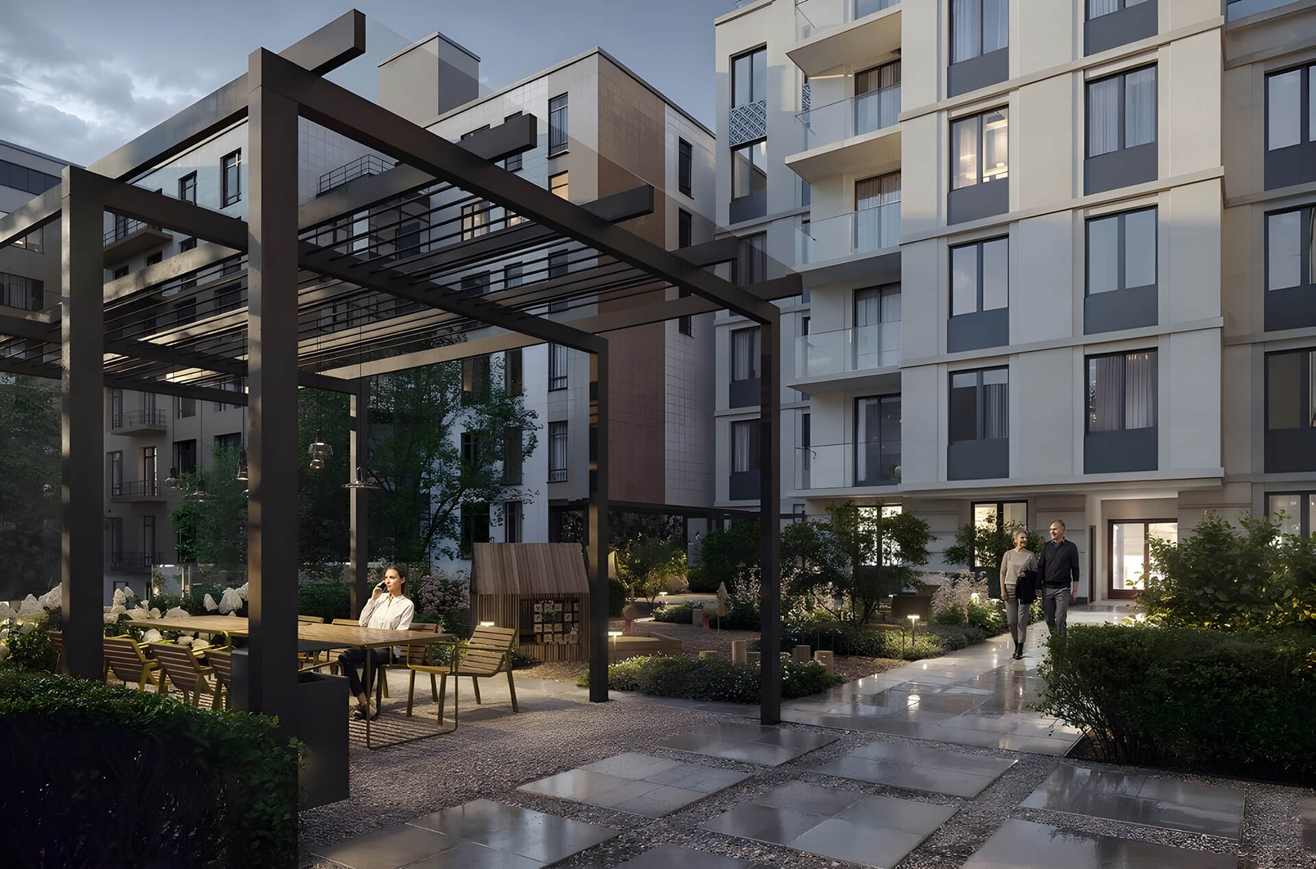 Сочетание малых архитектурных форм, живых растений и продуманного освещения создаёт особую атмосферу камерности. Двор закрыт от посторонних и обеспечивает безопасность. Для детей предусмотрены современные площадки, а взрослые могут насладиться лаунж-зонами.