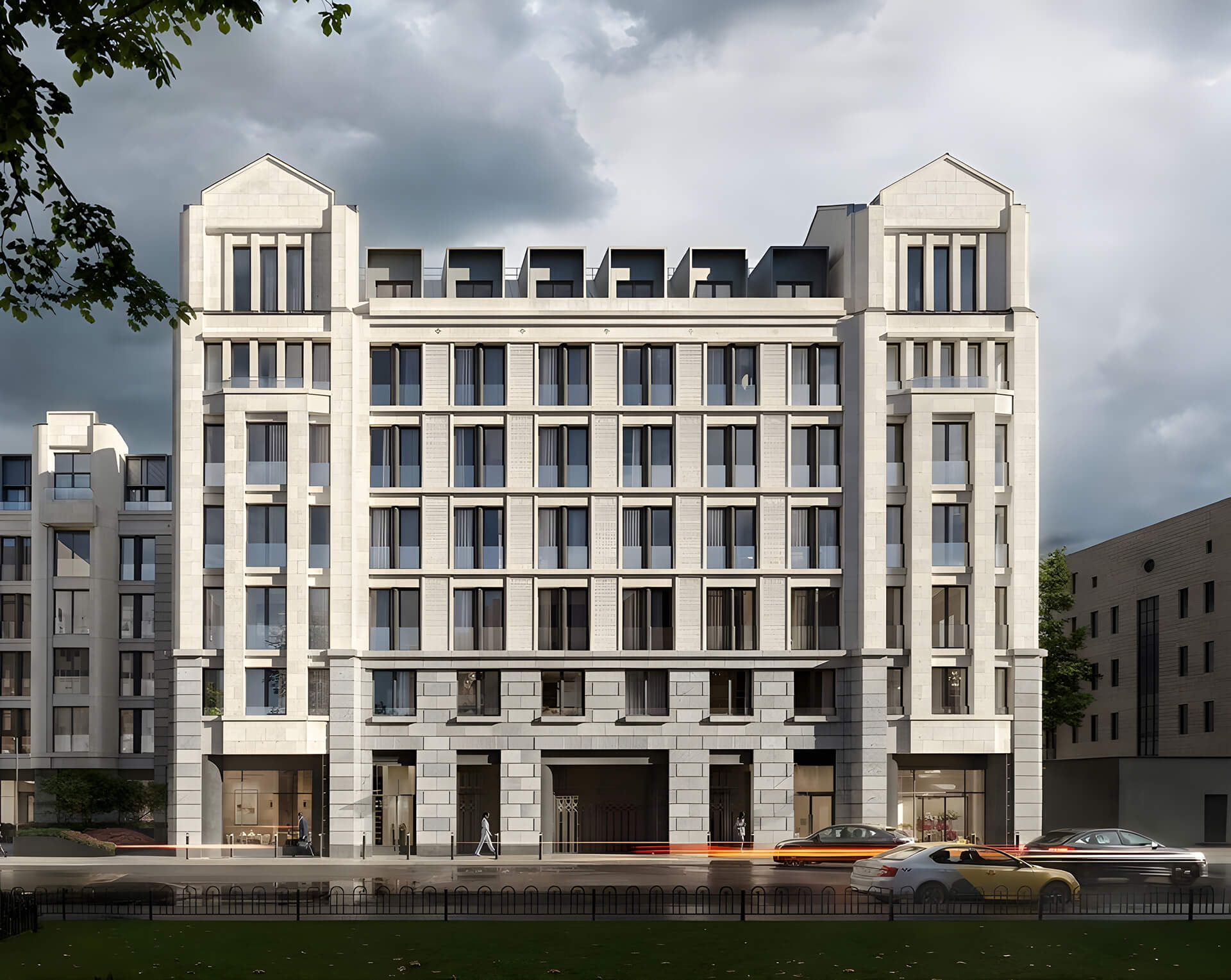 Гостевая стоянка не предусмотрена, что подчёркивает камерность и статус проекта. Кроме того, в доме предусмотрено 45 кладовых, расположенных на втором этаже, что позволяет жителям хранить сезонные вещи и поддерживать порядок в квартирах.